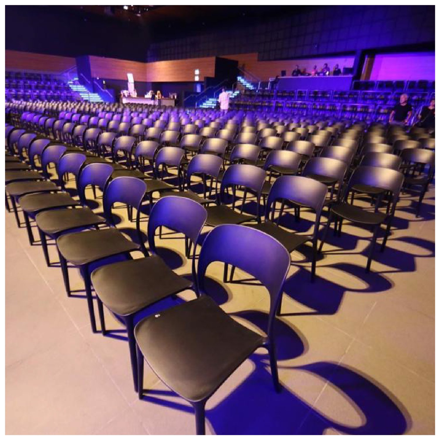 האולם מכיל חלל מלבני רחב ידיים ללא עמודים, רחבה מרכזית, טריבונות לישיבה סביב שולחנות,